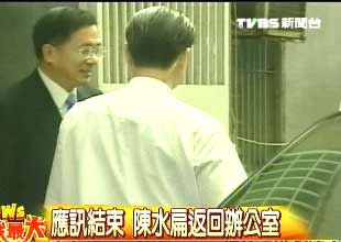 中新網9月3日電 陳水扁3日上午到特偵組,針對機要費做說明,在偵訊逾4小時之后,陳水扁離開特偵組,但沒有發表談話,快閃上車離開特偵組,回到特偵組對面的陳水扁辦公室。