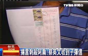 中新網(wǎng)10月24日電 據(jù)臺(tái)灣TVBS電視臺(tái)報(bào)道,陳水扁又遭到恐嚇!臺(tái)灣一名王姓男子寄了一封恐嚇信件到民進(jìn)黨黨中央,要求黨主席蔡英文轉(zhuǎn)告陳水扁,只要陳水扁參加25日的大游行,就會(huì)帶槍去刺殺陳水扁,信件內(nèi)還夾帶一顆子彈,民進(jìn)黨中央已經(jīng)將這封恐嚇信交給警方。