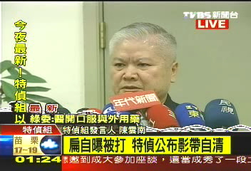 特偵組發言人陳云南:“我們的法警在警衛人員及律師的注視之下,銬上手銬,然后在警衛人員護衛之下,走下樓梯,到樓下的門口,在樓下門口的時候,陳前‘總統’把雙手高舉一段時間,我們的司法警察同仁把他的手按下來,請他上車,這過程中有我們本署的錄像帶,以及媒體記者朋友的錄像帶可以證明。”