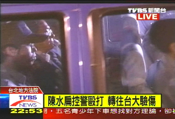 臺北地方法院11日晚間8點(diǎn)開庭,不久即出現(xiàn)“戲劇性”消息:陳水扁在庭審剛開始自稱在從特偵組到法院過程時(shí),遭到法警毆打,要求到醫(yī)院“治療”。臺北地方法院隨后決定暫停聲押庭,送陳水扁到臺大醫(yī)院檢查。經(jīng)過一個(gè)多小時(shí)的檢查后,陳水扁12日凌晨再度被帶回到臺北地方法院。臺北地方法院庭長12日凌晨向媒體表示,醫(yī)生會(huì)診結(jié)果顯示陳水扁并無大礙,僅發(fā)現(xiàn)“肌肉有輕微拉傷”,醫(yī)生認(rèn)為被告身體狀況仍可以出庭,因此,合議庭決定繼續(xù)召開聲押庭。