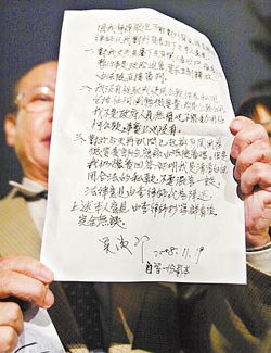 律師李勝雄走出寶徠代吳淑珍發表三點聲明的親筆簽名。(姚志平攝)