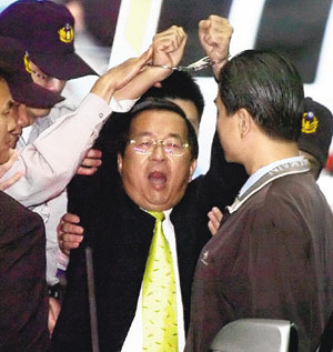陳水扁被收押高舉手銬的一幕。圖片來源:臺灣《聯(lián)合晚報》