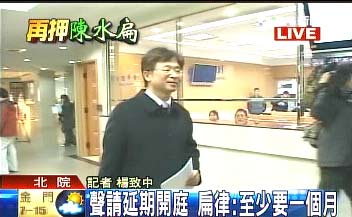 中新網1月14日電 據臺灣TVBS報道,陳水扁律師石宜琳14日下午出現在北院,他在4點遞狀,聲請1月19日至21日的準備程序庭延期,他以卷宗太多尚未看完,以及律見30分鐘無法與扁詳細討論案情為理由,希望延期至少1個月。