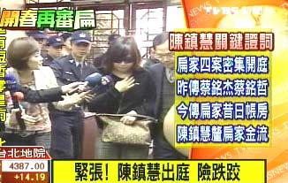 陳鎮(zhèn)慧從去年11月20日到今天,已經(jīng)有77天沒有公開露面,這段期間受到特偵組保護,因為她是扁案最關(guān)鍵也最重要的污點證人之一,而臺北地方法院今天要召開準備程序庭,陳鎮(zhèn)慧再度現(xiàn)身。