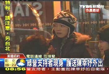 中新網2月6日電 據臺灣TVBS報道,人還在紐約的陳水扁女兒陳幸妤,在當地時間早上10點半左右,前往紐約大學牙醫(yī)學系,走出飯店時,出現綠營支持者,主動當起陳幸妤的自衛(wèi)隊,一度跟昨天向陳幸妤嗆聲的藍營支持者,發(fā)生口角。