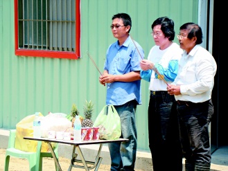 戴振耀陪邱義仁焚香拜拜,祈求風(fēng)調(diào)雨順年年收成好;他說,前晚兩人聊種田的事聊到12點(diǎn)多,邱義仁對(duì)務(wù)農(nóng)很有興趣。