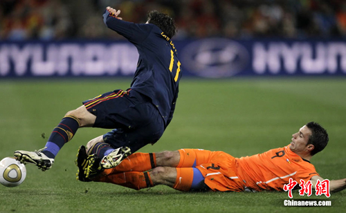 中新網7月12日電 今天凌晨2:30,南非世界杯迎來了最終的決賽,由荷蘭隊在約翰內斯堡的足球城球場對陣西班牙。最終雙方經過120分鐘鏖戰,由伊涅斯塔在第116分鐘攻入唯一一粒進球,絕殺十人應戰的荷蘭隊,史上首次奪得冠軍。