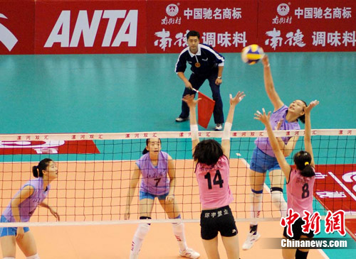 中新網漯河8月1日電 (記者 師紅壘 通訊員 林波)7月31日上午,2010年全國女排錦標賽(雙匯賽區)在漯河市體育中心體育館進行了交叉賽的4場較量,東道主河南隊0:3不敵缺席多名國手的全國女排聯賽七冠王天津隊,江蘇3:0戰勝遼寧,山東3:1擊敗云南,廣東0:3負于河北。四場比賽的具體比分是:天津-河南(25:16、25:16、25:11);江蘇-遼寧(25:21、27:25、25:18);山東-云南(25:21、20:25、25:19、25:21);廣東-河北(8:25、23:25、12:25)。