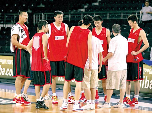 海外拉練已經大半個月,但男籃小伙子看起來沒一點疲憊。在一個半小時的訓練中,真打真槍,個個拼命。分組對抗中,大鵬被張兆旭狠狠地打掌打在手腕上、周鵬的眼睛被戳傷、丁錦輝快攻差點滑倒……穿著紅球衣的是主力陣容:易建聯、王治郅、劉煒、孫悅和王仕鵬,場下還站著周鵬和丁錦輝,這7人看來就是世錦賽中國隊的主力及輪換陣容了。