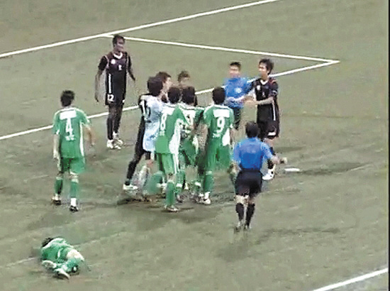其實從上半場開始,兩隊球員你來我往,態(tài)度強硬,互不相讓,已經隱約讓人感覺到一絲火藥味。到了下半場,雙方的動作越來越粗野。第88分鐘,場上比數(shù)為1比1時,北京國安隊的5名球員突然包圍幼獅隊的一名球員。接著,兩隊的球員紛紛沖進球場,彼此拳打腳踢打成一團。