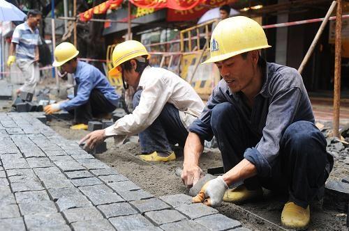 工人們?cè)跒閺V州市惠福路鋪上灰麻石