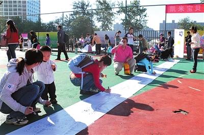 昨天上午9點(diǎn),建外SOHO文化體育廣場(chǎng)迎來(lái)首屆寶寶亞運(yùn)會(huì)。百余名寶寶在家長(zhǎng)的引導(dǎo)下,在象征著亞運(yùn)會(huì)開(kāi)幕時(shí)間的11.12米長(zhǎng)的橫幅上,親手寫下自己的名字和祝福。活動(dòng)現(xiàn)場(chǎng),寶寶們?cè)诟改傅呐惆橄卤M享運(yùn)動(dòng)的樂(lè)趣。據(jù)了解,此次活動(dòng)是由朝陽(yáng)區(qū)建外社區(qū)及中國(guó)婦女兒童喜愛(ài)品牌辦公室聯(lián)合主辦,橫幅將于近日寄往亞運(yùn)組委會(huì)。