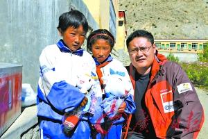 本報(bào)記者和達(dá)瓦(左)、卡嘎(中)兩位藏族小姑娘合影,她們手中抱著的正是廣州亞運(yùn)會(huì)吉祥物樂(lè)羊羊。 葛志浩 攝