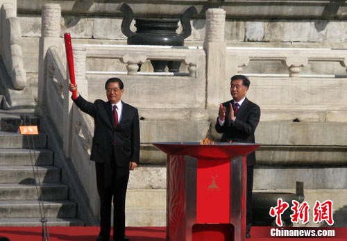 隨后,廣東省委書記汪洋從火種衛士手中接過引火棒,點燃祈年殿前的火種盆。中共中央總書記、國家主席胡錦濤在火種盆中點燃了主火炬,亞運北京首棒火炬手張琳從胡錦濤手中接過了火炬“潮流”。