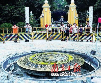 據介紹,原點標志表面微凸,高出地面15厘米,直徑3米。標志物外圍采用灰、黑兩色花崗巖作襯邊,沿放射線方向鑲嵌銅條,花崗巖表面陰刻了廣州建城歷史簡記。內側圓盤采用2厘米厚的黃銅板和巴西水晶石制成,重達3噸,圖案取材于南越王墓出土的“龍鳳玉佩”和“羽人駕舟”浮雕圖案,彰顯了嶺南文化特色。