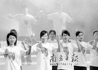 大學(xué)生們晚會(huì)現(xiàn)場(chǎng)學(xué)習(xí)手語(yǔ),為亞運(yùn)會(huì)到來(lái)做全面準(zhǔn)備。南方日?qǐng)?bào)記者王輝攝