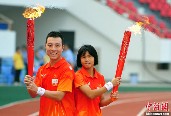 10月19日,第16屆亞運會火炬在惠州站傳遞。圖為中國圍棋名將古力(左)在火炬接力。中新社發 陳文 攝