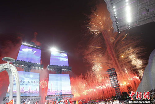 隨著中國總理溫家寶正式宣布亞運會開幕,整個會場和天空再次被無數絢爛的煙火照亮。