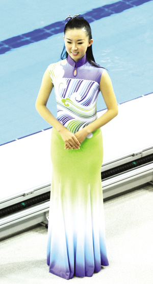 藍綠和黃綠交織,間或一抹白色,亞運頒獎小姐的禮服,有一個好聽的名字,叫做“行云流水”。穿在身上,能勾勒出禮儀小姐玲瓏婀娜的身段,展現別有一番韻味的東方美。