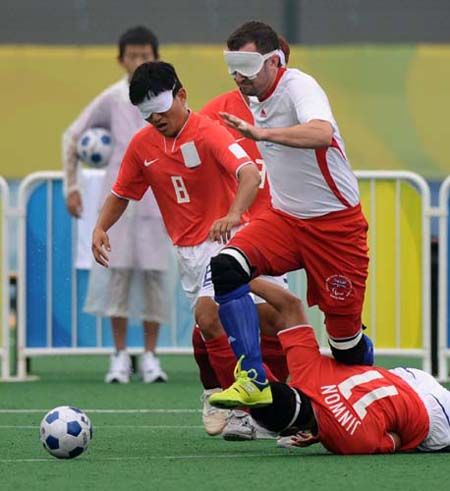 五人制(盲人)足球比賽是以攻破對方球門得分為目的而進行的同場攻守對抗項目。每隊由5名場上隊員和5名替補隊員組成,其中包括守門員和替補守門員各1名。除守門員外,其他隊員都為盲人。只有守門員可以在規定的區域內用手觸球。比賽中,進攻方目標是把球踢進對方球門得分,而防守方則是盡力阻止對方得分。