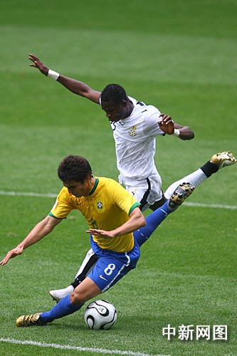 比賽開始后巴西隊并沒有急于大舉壓上進攻,第14分鐘加納獲得任意球機會,阿多的頭球被塞薩爾神勇撲出,力保巴西城門不失。第16分鐘巴西獲得角球,卡卡前點擺渡,效力俄羅斯莫斯科中央陸軍的前鋒瓦格納墊射破門,幫助巴西1-0領先。隨后比賽雙方互有攻守,但都沒有進球,上半場比賽結束,巴西1-0領先加納。
