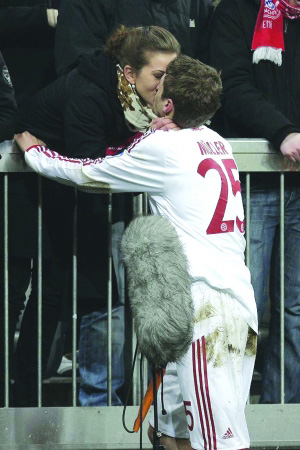 這位在租借而來的前鋒多諾萬回到美國大聯(lián)盟之后才得到出場機(jī)會的小將,在昨晨比賽的第72分鐘登場,這也是他在歐冠聯(lián)賽中的處子秀,然而17分鐘過后,他就在一次角球混戰(zhàn)中攻入了個人的歐冠聯(lián)賽處子球。進(jìn)球后的穆勒顯得非常興奮,飛奔到看臺上女友所在的位置,而他的女友很默契地送上了浪漫一吻。看到這對恩愛的小情侶,現(xiàn)場所有觀眾都送出了自己的掌聲。