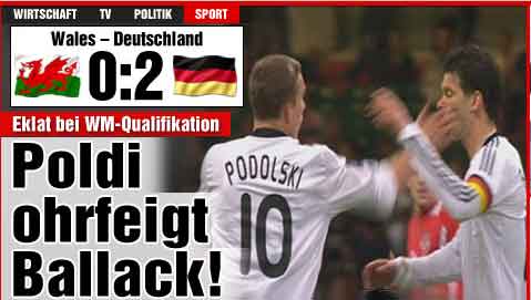 中新網(wǎng)4月2日電 在今天凌晨進行的一場世界杯歐洲區(qū)預選賽中,德國隊客場2-0輕取威爾士。不過在比賽中,隊長巴拉克和前鋒波多爾斯基發(fā)生沖突,被隊友在體育場眾目睽睽之下扇了一記耳光。