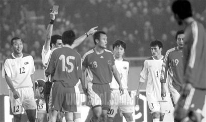 不僅如此,在國足第一個任意球射門出線之后,伊朗主裁以朝鮮隊金永俊提前移動為由,不但給金永俊出示了黃牌,還判任意球重罰。國足第二次也沒打進,此時主裁卻判再次重罰!這次的理由居然是杜震宇罰球時,主裁還沒鳴哨,為此,杜震宇又吃了黃牌,第三次罰球,曲波抽射偏出。如此一波三折的任意球,使得現(xiàn)場球迷也覺得搞笑,一位球迷說:“這個球不但吹得蹊蹺,而且罰了三次真是好耍……”