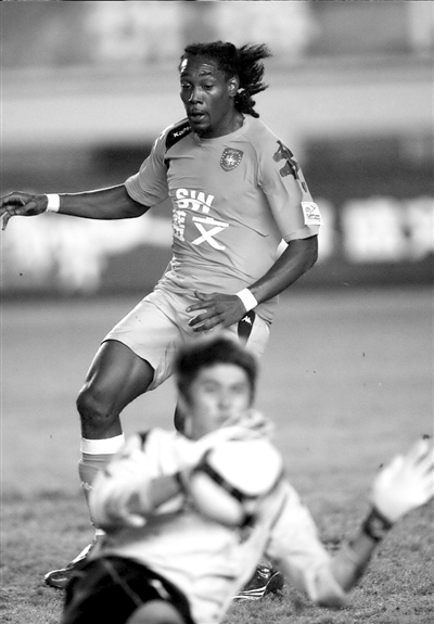 長春亞泰的作風令新帥非常欣慰。圖為青島隊球員布朗在門前包抄。