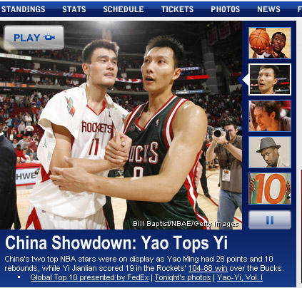 賽后,姚明和易建聯(lián)擊掌致意,這場(chǎng)中國(guó)德比也以中國(guó)球員的出色表現(xiàn)而收?qǐng)。而在比賽結(jié)束不久,NBA官方英文主網(wǎng)站在第一時(shí)間將易建聯(lián)的頭像放在顯要的位置,并介紹了這場(chǎng)中國(guó)球員之間的“攤牌”。