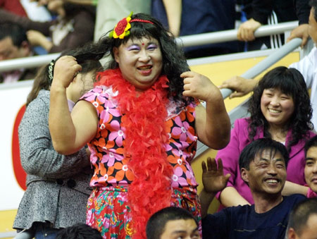 “如花”顯然是有備而來,他戴著花圍巾、穿著花衣裳,賽前先是戴著一個黑色的發套現身。比賽中他還到洗手間重新打扮,換上紅藍相間的發套再回到賽場。據當地媒體記者介紹,這個球迷是江蘇舜天隊的鐵桿球迷,大家都稱他“胖哥”。在足球場上,這個球迷也是如此打扮為江蘇舜天隊加油,看到舜天本周沒有比賽,他就到籃球賽場上來“湊熱鬧”了。(記者潘天舒)