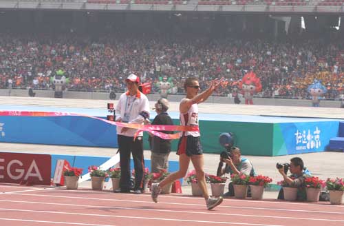 澳大利亞選手扎里德-塔蘭(Jared Tallent)沖過終點線瞬間。(圖片來源于北京奧運官網)