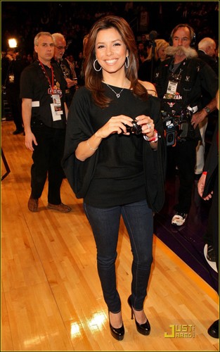 我們的絕望主婦伊娃·朗格利亞看來也是籃球迷啊,在NBA全明星賽的賽場看到了身穿黑色蝙蝠衫的伊娃·朗格利亞,性感的露肩款,配上緊身牛仔褲,高跟鞋,閃亮的大耳環熠熠生輝,連NBA的球星都爭著和她合影留念。