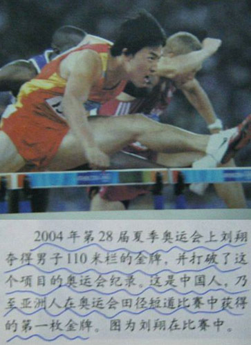 在圖片下附著的文字說明這般寫道:“2004年第28屆夏季奧運(yùn)會(huì)上劉翔奪得男子110欄的金牌,并打破了這個(gè)項(xiàng)目的奧運(yùn)會(huì)紀(jì)錄。這是中國人乃至亞洲人在奧運(yùn)會(huì)田徑短道比賽中獲得的第一枚金牌。圖為劉翔在比賽中!