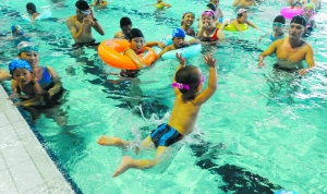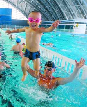伸伸腿,彎彎腰,一番準備后,小劉暢迫不及待地跑到泳池邊,父親劉先生抱起兒子,撲通一聲丟下水,接著又一把撈了起來。記者嚇了一跳,耳邊卻傳來小家伙“咯咯”的笑聲。“我給他試試水,適應一下!眲⑾壬忉,劉暢不怕水,對水有一種天生的親切感,這種夸張的“試水”方式,不會嚇到他,反而讓他感覺很“爽”。