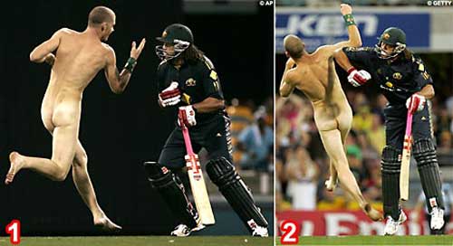 環球時報·環球網消息:3月4日,澳大利亞布里斯班市的加巴體育場內,澳大利亞國家板球隊同印度板球隊的對抗賽正在進行中。一名不速之客闖進了場地內,這名男子一絲不掛的飛奔在板球場上,與球場保安、球員玩起了“貓鼠游戲”。最后,這名“勇敢”的裸奔者被一名運動員擊倒在場地內,被警察帶出場地。迎接他的將是永遠不能踏進加巴球場的懲罰。