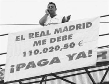 為了從皇馬俱樂(lè)部手中拿到這筆工程款,馬修鋁業(yè)公司老板卡洛斯·馬特奧不得不登上起重機(jī)上到高空,并貼出討債大字報(bào),他希望通過(guò)這種方式引起全西班牙的關(guān)注,并逼迫皇馬盡早支付這筆款項(xiàng)。