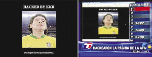這名自稱“KKR”的黑客篡改了阿根廷足協官方網站的內容,將原有的網站內容刪去,并將一張馬拉多納身穿巴西國家隊隊服的廣告截圖照片放在首頁上(點擊觀看廣告)。在“巴西版馬拉多納”的圖片上方,黑客囂張地留下了自己的名字——“HACKED BY KKR”,而在圖片下方,這名黑客用西班牙文寫了一段話“Una imagen vale más que mil palabras”,意為“一張照片勝過千言萬語”。