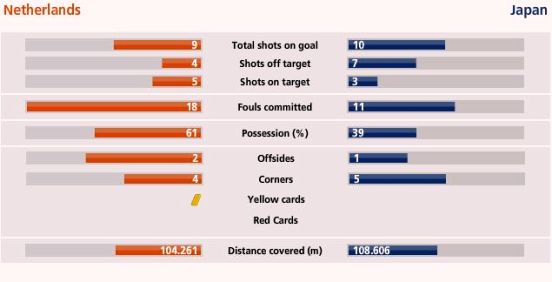 荷蘭隊全場比賽有9腳射門,5次射中門框范圍內,其中包括一個進球和兩次被日本隊門將川島永嗣化解的必進球機會。日本隊有10腳射門,3腳射中門框范圍,其中最后階段的一次射門險些將比分追平。日本隊的角球同樣多于荷蘭隊,5次角球,比荷蘭隊多了一個。