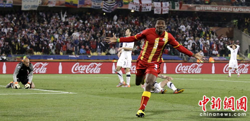 中新網(wǎng)6月27日電 今天凌晨2:30,南非世界杯1/8決賽第二場(chǎng)美國(guó)與加納的比賽,在勒斯滕堡的皇家巴福肯球場(chǎng)拉開戰(zhàn)幕。憑借普林斯·博阿滕和多諾萬(wàn)在上下半場(chǎng)的進(jìn)球,雙方在90分鐘之內(nèi)戰(zhàn)成1-1平。而加時(shí)賽中,中鋒吉安突破射門建功,幫助加納隊(duì)昂首晉級(jí)八強(qiáng)。