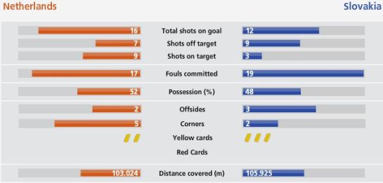 控球方面,荷蘭隊在領先后有所放松,但仍以52%的控球率領先于對手的48%。荷蘭隊在比賽中獲得了5個角球,斯洛伐克獲得了2個。斯洛伐克在補時的最后階段獲得了全場唯一的一個點球,維特克主罰命中。荷蘭隊有2次越位,斯洛伐克為3次。