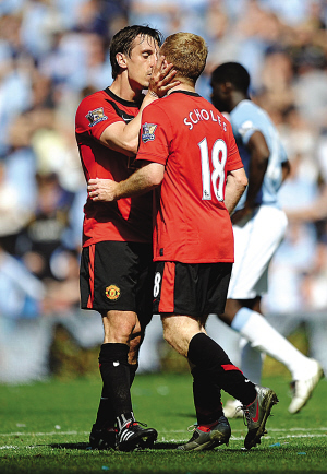 英超第35輪的一場強強對決,自然是曼城斯特市的同城德比。最終,曼聯憑借35歲的老將斯科爾斯在下半場補時第2分鐘的頭球絕殺,在客場以1:0險勝同城死對頭曼城隊。令人意外的是,同為35歲的曼聯隊長加里·內維爾居然在場上公然激吻進球功臣斯科爾斯以示慶祝。