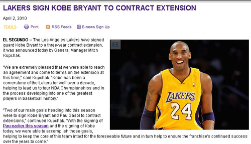 中新網(wǎng)4月3日電 當(dāng)?shù)貢r(shí)間4月2日,NBA洛杉磯湖人隊(duì)在其官方網(wǎng)站上宣布:已與隊(duì)中頭號(hào)球星科比正式續(xù)約三年。