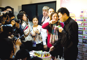 這時(shí),丁俊暉媽媽拿起切好的蛋糕,親手給兒子喂了起來(lái),不時(shí)還有人沖丁俊暉喊著:“小暉加油!小暉最棒!”此時(shí)賽場(chǎng)的緊張氣氛煙消云散,取而代之的則是溫馨與祝福,現(xiàn)場(chǎng)不時(shí)有記者感嘆,“場(chǎng)面太感人了”。在場(chǎng)的記者們也多了份口福,丁俊暉的生日蛋糕正好當(dāng)成了記者們的“消夜”。