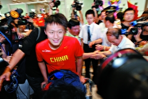 張琳推著行李車,走在運(yùn)動(dòng)員隊(duì)伍的最前面,他接連接過(guò)兩束鮮花。攝影記者將他團(tuán)團(tuán)圍住,閃光燈閃爍個(gè)不停。昨天中午,中國(guó)游泳隊(duì)載譽(yù)返京,在首都機(jī)場(chǎng)張琳成為最受關(guān)注的明星。接受采訪的間隙,還忙著給粉絲簽名。
