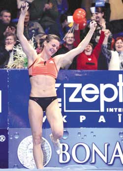 昨天,在烏克蘭頓涅茨克進行的室內田徑賽中,伊辛巴耶娃以4米95的成績打破女子室內撐桿跳高世界紀錄。