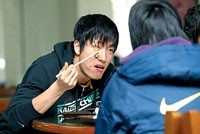 劉翔迅速返回公寓,套上帽衫,陽光很燦爛,劉翔很愜意,他“大搖大擺”、仰著頭,輕哼著流行歌走向食堂。“來了啊!”一走進(jìn)二樓田徑隊(duì)的飯?zhí)茫⒓从袕N師倍兒親切地招呼他,劉翔笑著說“餓了”。跨欄組幾個(gè)人坐到東北角,這是他們的“老地方”。接著劉翔和大伙兒一起排隊(duì),盛上青菜、棒骨、肉末燉粉條、炒雞蛋和白米飯,又拿了個(gè)柚子。