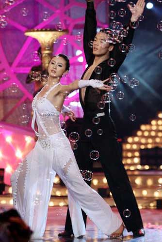 這次來上海參加《舞林大會》,戴菲菲可以說是一撥人中最手忙腳亂的一個。上臺比賽前兩天晚上剛到上海,前一天的晚間10點才剛編完自己的舞,第二天晚上就直接上節目了,難度可想而知。而對于國標舞,她也可以說是完全的零起點。她選挑的舞種是倫巴,考慮到訓練時間實在太短,她的這段舞蹈中被加上了大把的體操情節。