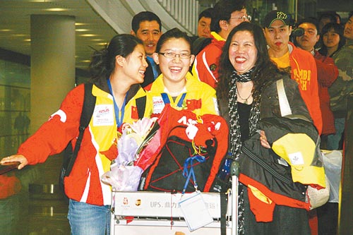 中國(guó)女子冰壺隊(duì)昨天在韓國(guó)奪得世錦賽冠軍的消息在國(guó)內(nèi)引起了轟動(dòng)。今天下午,當(dāng)她們從韓國(guó)飛抵北京首都機(jī)場(chǎng)后,數(shù)十名守候的記者把她們團(tuán)團(tuán)圍住,一向很少有人關(guān)注的中國(guó)冰壺姑娘面對(duì)大堆相機(jī)和話筒,感到受寵若驚,在賽場(chǎng)上以沉著冷靜著稱的隊(duì)長(zhǎng)王冰玉,在這一刻也激動(dòng)得說(shuō)不出話來(lái)。