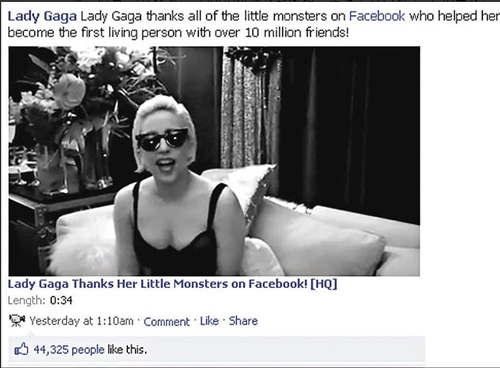 榮登在世人氣女王,她向粉絲發twit說:“多謝那么多小魔怪在facebook追隨我。我有1,000萬個互相緊扣的朋友!毙∧Ч謑ittle monsters,正是她給粉絲的昵稱。